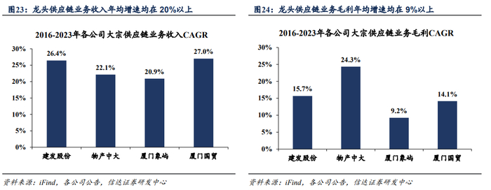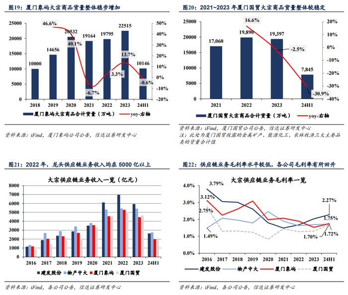 龙头供应链企业大宗商品经营货量稳步增加,供应链业务收入年均营收及毛利增速均较高,毛利率已有回升。货量情况看,头部大宗供应链企业业务量稳步增长。2024年上半年,建发股份经营的大宗商品货量总计近10500万吨,同比增速近9%,多个核心品类继续保持行业领先地位。其中:钢材经营货量超3300万吨,同比增长超13%;农产品经营货量超2000万吨,同比增长超28%。厦门象屿的大宗商品经营货量基本也保持稳步增加,2023年货量总计超2.2亿吨,同比+13.7%;24H1货量总计10146万吨,同比基本持平。2023年厦门国贸在金属矿产、能源化工、农林牧渔三大主要品类的货量合计值达到1.94亿吨,同比-2.5%。营收情况看,2022年大宗供应链龙头企业的供应链业务收入均在5000亿元以上,营收规模较大。毛利率方面,供应链业务毛利率较低、整体较稳健,2023年受多重不利因素扰动,毛利率有一定下降,24H1已有一定回升,业务盈利改善。从年均增速看,龙头企业的供应链业务营收在2016~2023年年均增速均在20%以上,收入保持快速增长;毛利年均增速均在9%以上,盈利也有稳定提升。
