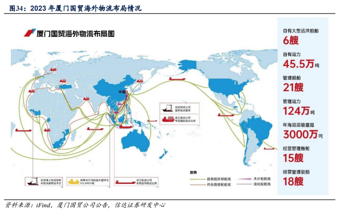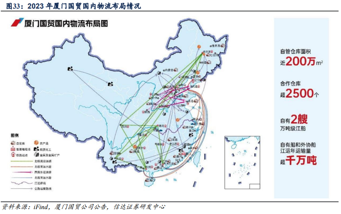 2)构建链接海内外市场的网络化物流服务体系,为客户提供高品质、全流程、定制化的大宗商品物流解决方案。厦门象屿培育了三大物流运营主体象屿速传、象道物流、象屿农产,将商品遴选与物流服务匹配,开展区域仓和物流整合,通过“物贸联动”介入到产业链更多服务环节中,加强客户粘性,进一步巩固产业链上下游市场地位。
