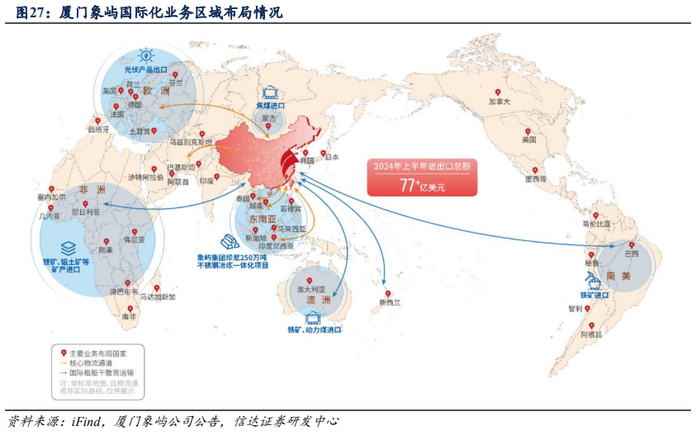 3)建立全球化渠道,战略布局国际市场,挖掘海外需求。厦门象屿已在众多产业链积累了一批优质的头部企业客户资源,构建了成熟稳定的全球业务渠道。目前,公司在境内已成立10家平台公司,业务触达34个省级行政区,核心业务区域由沿海逐步向内陆延伸,重点挖掘中西部地区现代化产业集群的供应链需求。