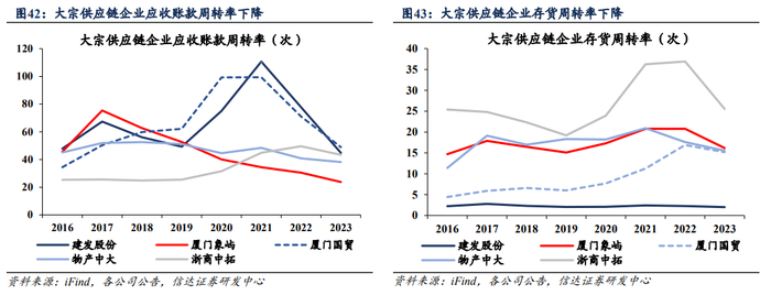 3)2023年影响已结束,结构性调整单吨利润或上行。2023年工业景气度较低,大宗商品市场需求放缓,价格较明显下降,客商企业经营活跃度降低,商品货物、货币资金等周转放缓。大宗供应链企业一方面信用风险加大、风控要求提升,另一方面为保障业务长期稳定性、主动让利客户,企业应收账款及存货周转率均有较明显下降。此外,大宗供应链服务商保存的部分风险敞口也受到大宗商品价格下行影响,盈利下滑较多。后续看,我们认为经济景气度或已接近底部,政策端也有诸多利好提振行业需求,大宗商品市场有望迎来周期上行拐点。同时,大宗供应链企业主动收窄风险敞口、调整货种结构、提升风控要求,严控信用风险。多重因素叠加,企业商品单吨毛利有望回升。