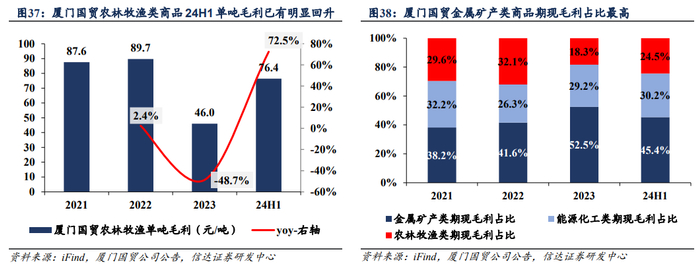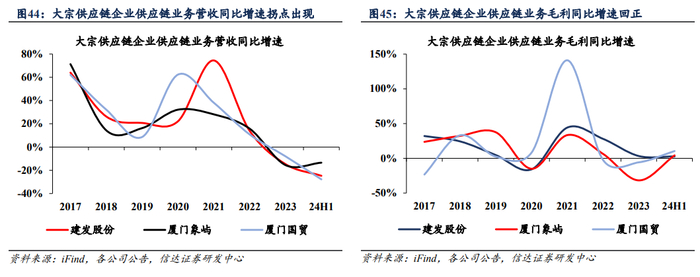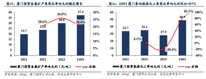 2)服务链条延伸,单位货量利润中长期或有上行趋势。建发股份、厦门象屿及厦门国贸等龙头企业积极拓展品类货种,延伸上下游供应链,提升货量稳定客源,保证业务盈利稳定性。单吨毛利看,厦门象屿整体大宗商品单吨毛利较稳健,金属矿产类商品单吨毛利基本能保持在40元/吨左右。厦门国贸的金属矿产类商品单吨毛利稳定增长,24H1达到37.4元/吨,能源化工类商品单吨毛利稳健,24H1回升至48.9元/吨,超过以往水平。