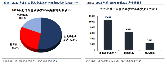 厦门国贸:公司目前拥有“冶金、能化、纺织、有色、浆纸、农产、橡胶、新能源”八条成熟产业链。公司主要在铁矿、钢材、煤炭、铜及制品、粮食谷物等方面经营货量较大、行业规模居前。2022年,公司铁矿经营货量超8000万吨,同比增长超20%;2023年钢材经营货量超3500万吨,同比增长超20%;煤炭经营货量超4500万吨,同比增长超30%。