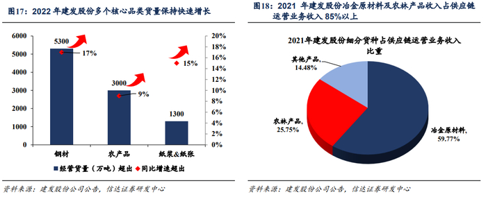 建发股份:公司在冶金原材料(黑色、有色金属及矿产品等)、农林产品(农产品、纸浆等)多个核心品类保持行业领先地位。2022年,公司经营的黑色、有色金属、矿产品、农产品、浆纸、能化产品等主要大宗商品的经营货量约2亿吨,同比增速近10%。其中:钢材经营货量超5300万吨,同比增长超17%;农产品经营货量超3000万吨,同比增长超9%;纸浆、纸张合计经营货量超1300万吨,同比增长超15%。
