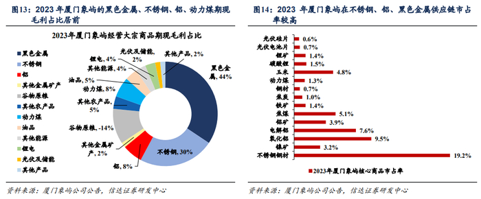 厦门象屿:公司目前主要经营金属矿产、农产品、能源化工、新能源等大宗商品,涵盖“黑色金属、铝、不锈钢、新能源、煤炭、油品、谷物原粮”七大核心品类。毛利情况看,2023年金属矿产中的黑色金属、不锈钢、铝产品等合计贡献了80%以上毛利,是公司最主要的利润来源。市占率上,公司主要在不锈钢、铝产品、焦煤、玉米等领域市占率居前,尤其是不锈钢钢材领域,2023年市占率高达19.2%。