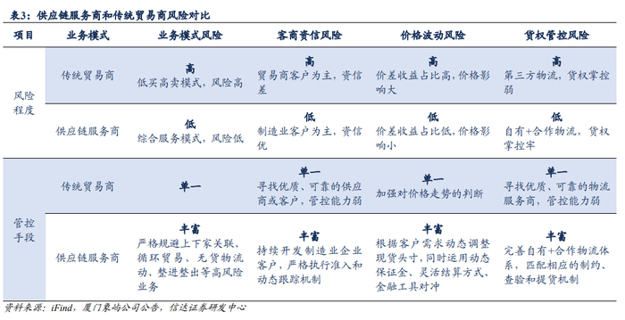 业务模式改变后,大宗供应链企业主要盈利来源改变、行业风险管控水平提升。企业利润来源由此前主要赚取买卖差价逐渐转变为主要赚取提供大宗商品流通服务的服务收益等,有效降低了对大宗商品价格波动趋势的依赖性、降低周期性影响。风险管理上,企业能对业务模式、客商资信、商品价格、物流货权等方面风险,建立更加及时高效的风控管理体系,有效保障经营稳定性。