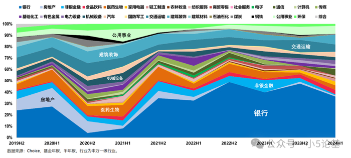 以产品的历史持仓为例,以银行为代表的大金融板块(除了银行之外还包括房地产和非银金融)长期占有较高的比重,整个板块的平均占比超过40%。