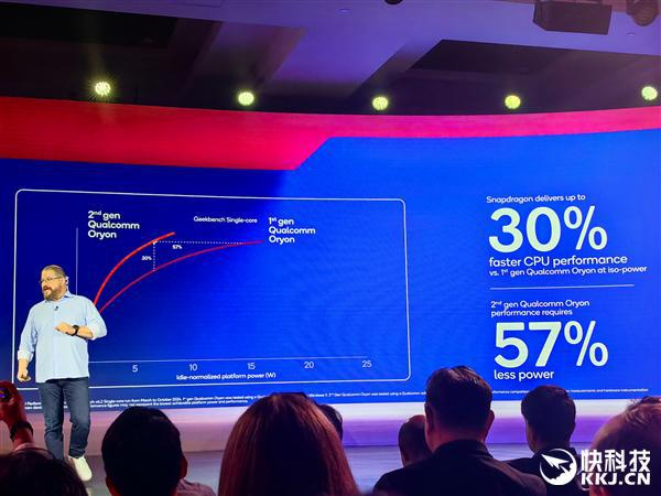 首先,二代Oryon架构对比一代,同等功耗下的性能提升最多30%,而同等性能下的功耗可降低最多57%。