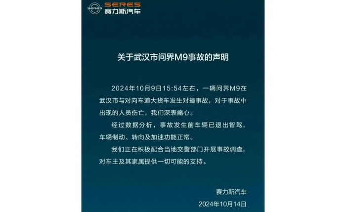 10月14日,赛力斯发布关于武汉市问界M9交通事故的声明,表示经过数据分析,在事故发生前,车辆已经退出智驾,且各项功能正常。