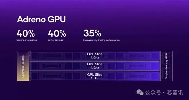 GPU方面,骁龙8 Elite采用的是全新的Adreno 830 GPU,基于新的切片架构,拥有三个切片,每个切片以 1.10GHz 的时钟速度运行,并具备 12MB独立缓存。相比上代GPU,游戏性能提升了40%,能效提升40%,光线追踪性能提升了35%。