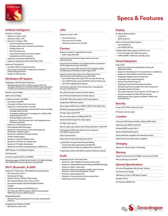 此外,骁龙8 Elite还支持 UFS 4.0、5.3 GHz 的LPDDR5x 内存、USB 3.1 Gen2、IEEE 802.15.4z、精细测距 (FiRa)等功能。