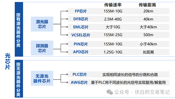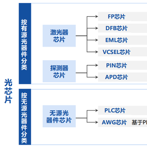 (1)有源光芯片:包括激光器光芯片、探测器光芯片,主要应用于光模块领域,主流产品为FP、DFB、EML、VCSEL、PIN、APD芯片。