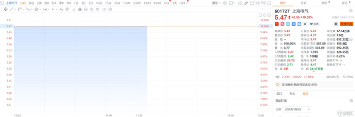 受公司并购及回购利好消息刺激,10月22日,上海电力A股一字涨停,报5.47元,股价创2021年9月以来新高,总市值达到852.22亿元。这也是该股连续第二日一字涨停。