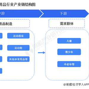 体育用品产业链上游为棉纺、羊绒、皮革、印染、化纤、塑料、合成橡胶等非金属原材料以及钢铁、铝合金、不锈钢等金属原材料;产业链中游的体育用品制造,包括球类产品、体育器材、训练健身器材、运动防护用具、运动服装、运动鞋等;产业链下游为各类需求群体。体育用品产业链结构图如下: