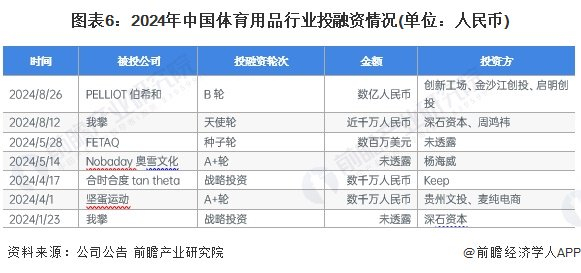 从2024年的投融资事件来看,我国体育用品行业投融资以早期轮次为主,融资规模在数千万至数亿人民币,融资方主要是细分体育赛道品牌,如瑜伽、攀岩、冰雪运动等: