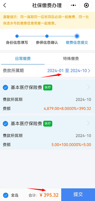 第四步,确认费款所属期和缴费金额无误后,点击提交并完成缴费。