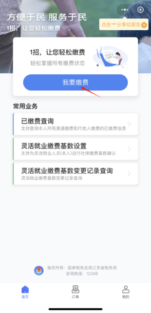 第一步, “江苏税务社保缴纳”小程序首页点击“我要缴费”。(初次使用,需按提示完成实名认证后,再使用当前功能)