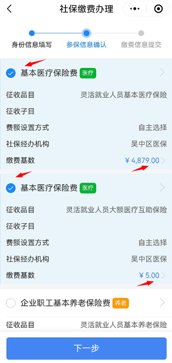 第三步,参保信息确认,打勾选择需要缴费的保险费种,确认缴费基数正确后,点击下一步。