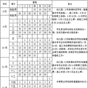 幼儿园、义务教育阶段学校、普通高中学校新高一、高二年级,8月29日教职工报到,8月30日、31日学生报到,9月2日正式上课。新高三年级8月26日正式上课。小学每天早上上课不得早于8:20,初中不得早于8:00。