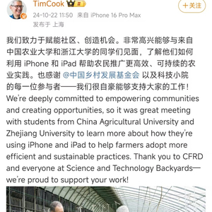 10月22日,苹果CEO库克发布微博表示:“我们致力于赋能社区、创造机会。非常高兴能够与来自中国农业大学和浙江大学的同学们见面,了解他们如何利用iPhone和iPad帮助农民推广更高效、可持续的农业实践。”