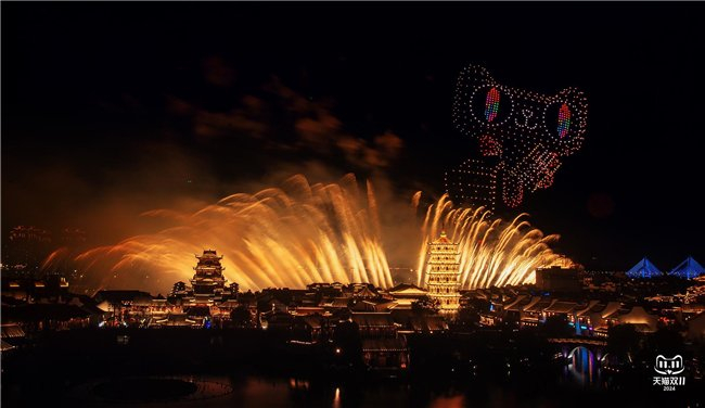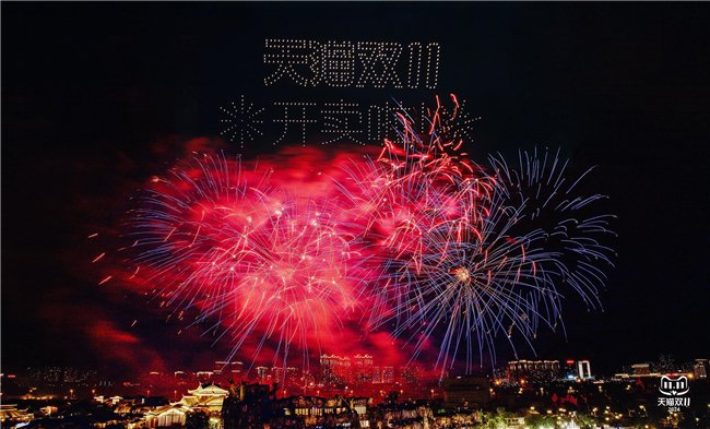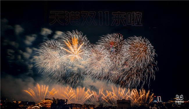 天猫率先送上“天大的好福气”烟花,造型各异的烟火装点“你好福州”“天猫双11来啦”“天大的心愿从天猫开始”等口号,宣告双11盛大开启。