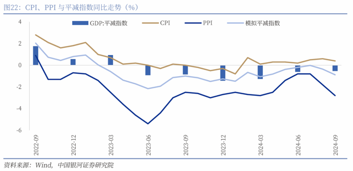 9月CPI同比增速为0.4%(前值0.6%),PPI同比增速进一步下探,录得-2.8%(前值-1.8%),物价表现不及预期表明我国经济有效需求仍然不足,基本面处于弱修复阶段。实际上,CPI同比自从2023年以来便处于低位震荡,PPI同比自2022年10月以来已经连续24个月为负,GDP平减指数也已经连续6个季度为负值,价格水平持续低迷的背后对应较为疲软的内需。今年以来,消费和投资的恢复力度仍不及预期,反映出内需动力乏力,此外,房地产行业的下行也对上下游产业链形成了较大的负面影响,进一步拖累了整体经济的修复进程,物价走弱趋势尚未见到反转信号。
