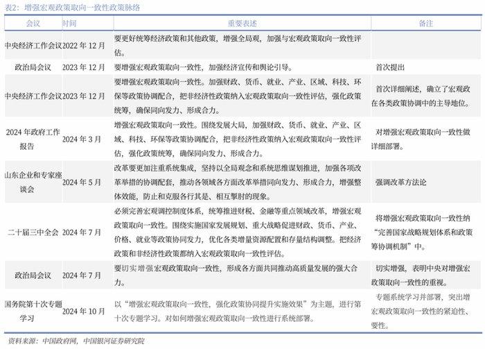 一是增强宏观政策取向一致性是提升宏观调控效能的重要抓手。完善宏观调控制度体系,增强宏观政策取向一致性,是推进国家治理体系和治理能力现代化的客观要求,对推动我国经济高质量发展具有重要意义。特别是当前宏观经济治理的复杂性明显上升,要用系统性的思维、方法和措施,优化政策资源和工具的配置组合,释放更大的政策效能。2023年12月政治局会议首次提出,要增强宏观政策取向一致性。2023年中央经济工作会议对此进行了详细阐述,指出“要增强宏观政策取向一致性。加强财政、货币、就业、产业、区域、科技、环保等政策协调配合,把非经济性政策纳入宏观政策取向一致性评估,强化政策统筹,确保同向发力、形成合力。”二十届三中全会《决定》将增强宏观政策取向一致性纳入“完善国家战略规划体系和政策统筹协调机制”中。强调“必须完善宏观调控制度体系,统筹推进财税、金融等重点领域改革,增强宏观政策取向一致性。”7月政治局会议强调要“要切实增强宏观政策取向一致性,形成各方面共同推动高质量发展的强大合力”。10月国务院以“增强宏观政策取向一致性,强化政策协同提升实施效果”为主题,进行第十次专题学习。这些充分凸显当前增强宏观政策取向一致性的必要性、紧迫性、重要性。