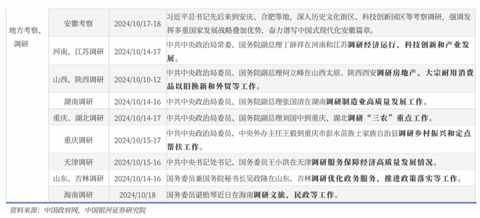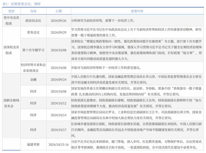 第一,当下一揽子政策是中央层面自上而下一次系统部署。9月26日,总书记主持召开政治局会议,亲自部署下一步经济工作,拉开本轮史诗级宏观调控的号角。围绕加大宏观政策逆周期调节、扩大国内有效需求、加大助企帮扶力度、推动房地产市场止跌回稳、提振资本市场等五个方面,系统部署一揽子增量政策。一般情况下经济工作并不是9月政治局会议的主要议题,本次9月政治局会议超常规召开并重点讨论当下经济形势已经说明了当局稳增长的决心。9月29日,国务院总理李强主持召开国常会,研究部署一揽子增量政策的落实工作。之后,一系列重磅发布会频频亮相,一系列增量政策加快出台。其政策出发点是全面贯彻落实9.26政治局会议精神,加快落实一揽子增量政策的具体部署。10月8日,发改委系统介绍落实一揽子增量政策有关情况。10月12日,财政部介绍加大财政政策逆周期调节力度相关情况,增量财政将重点支持地方化债、国有大型商业银行补充核心一级资本、推动房地产市场止跌回稳等多方面。10月14日,国家市场监督管理总局等四部门介绍加大助企帮扶力度有关情况。10月17日,住建部等五部门介绍促进房地产市场平稳健康发展有关情况。此外,9月24日,“一行一局一会”已推出一揽子金融政策,包括降准、降息、降存量房贷利率、降首付比例、创设两项用于支持资本市场稳定发展的工具等,力度超出市场预期,着力稳经济、稳就业、稳市场、稳预期。此外,近期党中央、国务院领导悉数赴地方调研,加快督导政策落实,推动经济持续回升向好,努力完成全年经济社会发展目标任务。