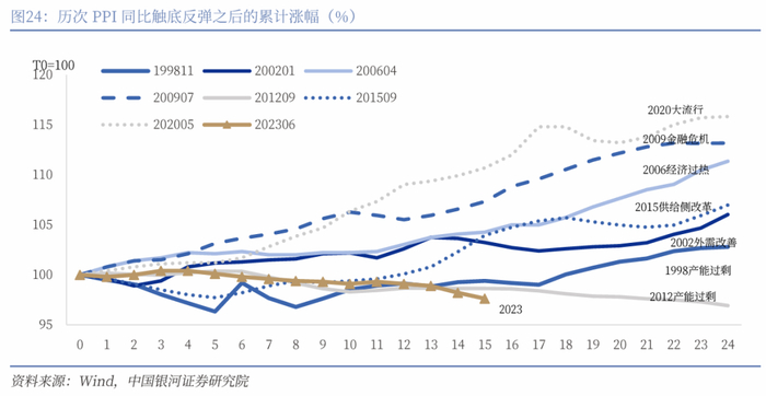 为了排除基数效应的影响,我们以PPI同比低点出现的月份所对应的价格为100,观察此后价格指数的累计环比涨幅,可以更加清晰地观察历次PPI触底之后的价格反弹情况,大致分为以下几种模式: