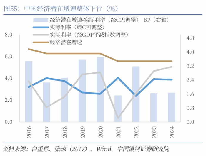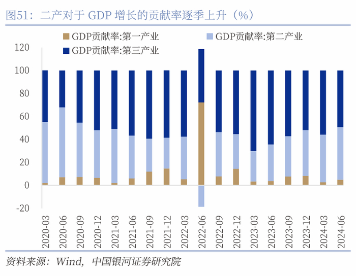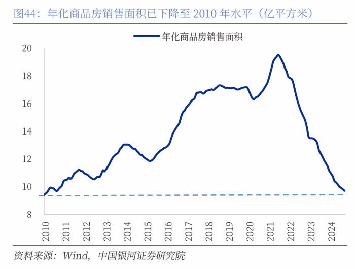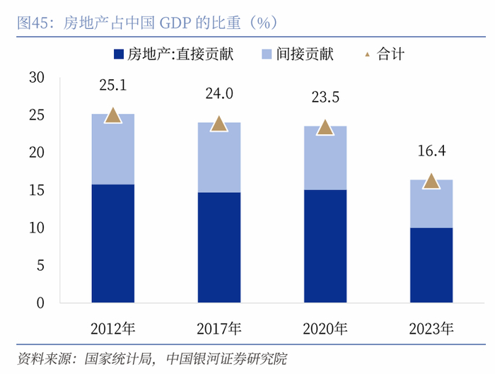 一是房地产市场的拖累作用正在逐步放大。2021年底以来,房地产市场已经连续快速向下调整了将近3年时间,2024年9月的商品房销售面积(季调、折年)已经下降至2010年的水平。一方面,我们可喜地看到高质量发展扎实推进,在房地产开发投资增速几乎连续三年两位数负增长的情况下,GDP增速依然能稳定在5%附近。我们根据投入产出表进行分析,2020年房地产及其上下游行业在GDP中的比重约为23.5%,但2023年已经下降至16.4%,实际经济增长似乎实现了对于房地产的脱敏。