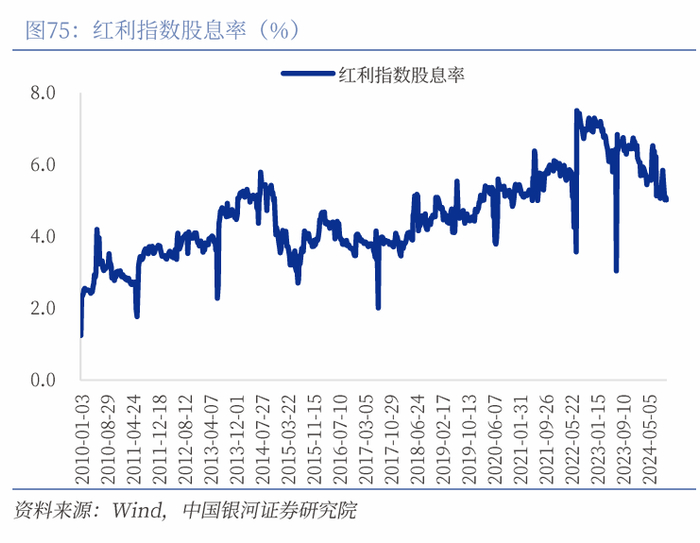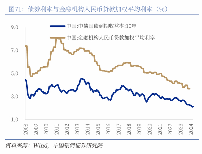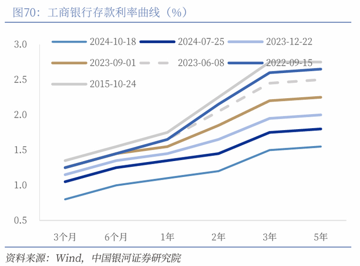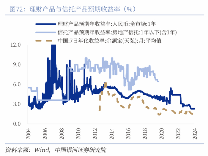 降息周期下,“安全”资产的收益率下行。目前中国存在负的产出缺口,货币政策处于宽松周期,在此背景下,政策利率下行,通过期限溢价和信用溢价传导,10年期国债收益率、存款利率和贷款利率趋于下行。观察工商银行存款利率曲线,2022年至今,5年期定期存款利率累计下行120BP,为1.8%。理财产品的预期收益率也处于下行趋势,1年期人民币理财产品预期收益率已从2022年初5.0%的水平下降到约2.3%左右。余额宝的7日年化收益则从2.05%下滑至1.45%左右。