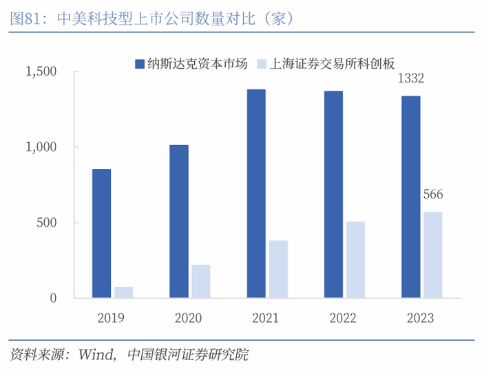 成熟资本市场在支持科技型企业方面发挥作用显著,而我国科技创新企业在资本市场中占比偏低,我国资本市场支持空间可期。以美国为例,美国纳斯达克资本市场主要针对美国高科技及中小企业,2023年,该市场上市公司企业数量达到1332家,而我国与之对应的科创板上市企业数仅为566家。对比我国A股市场和发达国家股票市场行业结构(截至2024年10月15日)可以发现,我国股票市场中高科技企业市值占比仅为16%(数据为信息技术行业),而美国和英国股票市场中信息技术领域占比均高达30%以上。我国资本市场对科技创新的支持力度可进一步增强。