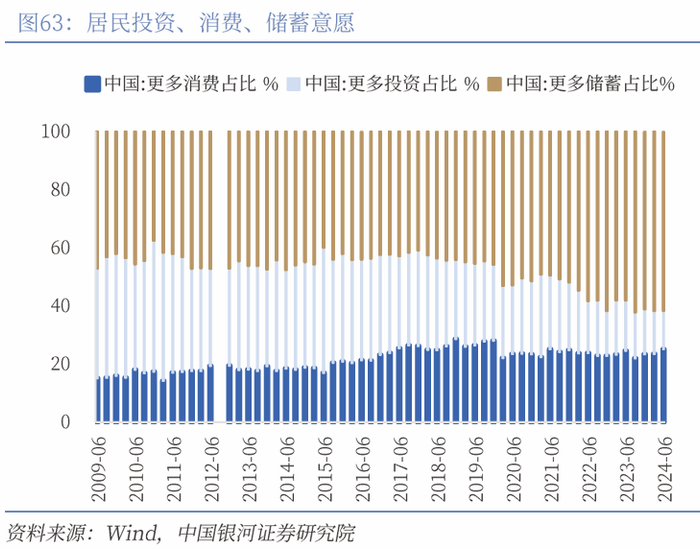 房地产价格下行,资产价格带来通胀预期走低,进一步降低了居民投资、消费意愿。资产价格与通胀预期有较强关联,中国居民资产主要配置在房产,房地产价格下行会带来通胀预期走低。央行城镇储户问卷调查显示,未来房价预期与物价预期有较强的相关性。而通胀预期的走低会进一步影响居民的投资和消费意愿,形成向下螺旋,更多消费和投资的占比自2020年开始下行,而更多储蓄的占比则明显提升。