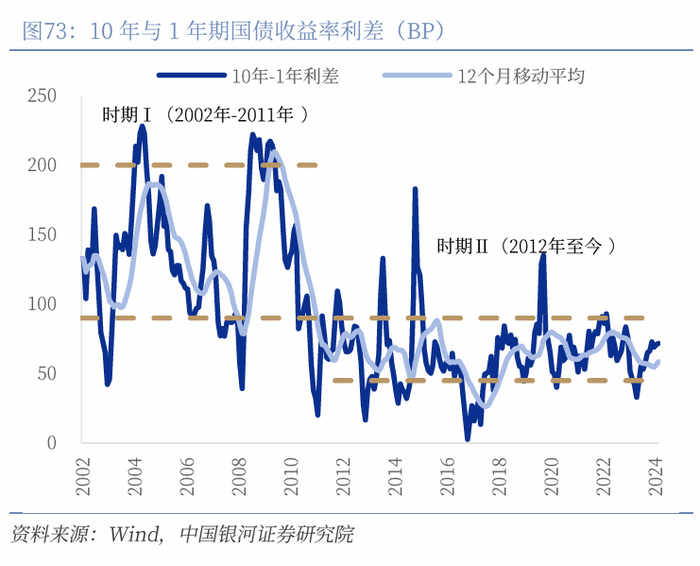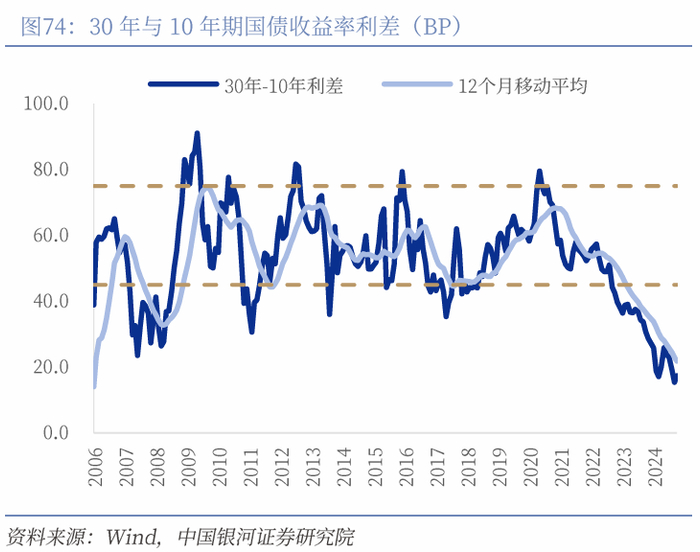 低利率时代对于超长期国债需求上行。10年期国债收益率从2023年初2.9%左右的位置,累计下行约75BP,目前在2.1%-2.2%的区间波动。30年与10年期国债收益率利差则在2023年初开始,向下突破2006年以来的运行区间(45BP-75BP),并不断下行,目前已收窄至17BP左右。这背后反映的是低利率时代,为获得相对较高的收益,对于超长期国债需求上行,交易拥挤。