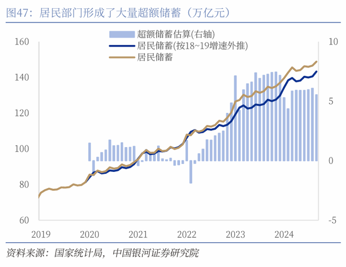 消费与投资需求的低迷带来居民超额储蓄增加。上文提到,目前中国居民积累了大量超额储蓄,规模约为5.5万亿元这部分财富有待激活配置。