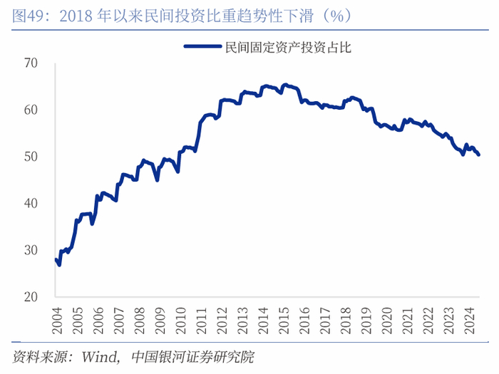第三,耐用品消费更换周期被进一步拉长。中国居民耐用品置换周期与买房/换房密切相关。楼市不振导致家具、家电、建筑装潢等地产后周期消费持续低迷表现,2024年9月与2019年相比,上述三项消费品在社会消费品零售总额中的比重下降了0.61个百分点。