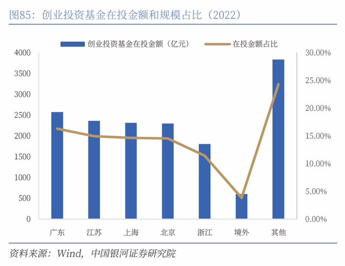 一是土地财政转型下,地方政府因地制宜发展新质生产力。过去土地财政发展下,全国基建普遍过剩,未来大多数三、四线地方政府将更过回归民生相关的基本职能,而一、二线城市和核心都市圈的地方政府拥有更多人力和技术资源转向股权财政。实际上,从目前所谓“股权财政”的全国布局来看,创投基金和政府引导基金主要聚集在发达经济带。截止2022年末,我国创业投资基金案例数量中北京、广东、江苏、上海、浙江合计数量49604个,占全国案例数的76.09%,投资规模合计1.13万亿元,占全国投资总额的71.87%。在地域分布上,科创投资和股权投资的头部聚集效应较为显著。
