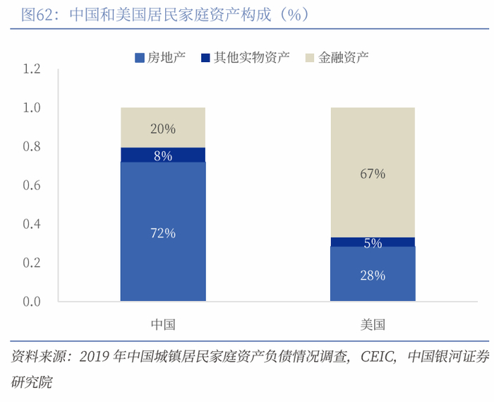 过去相当长时间,房价持续上涨导致中国家庭部门形成对房地产投资的过度偏好,居民资产负债表中高达60-70%的房地产占比显著高于全球平均水平。在未来经济转型过程中,房价很难复制过去那种系统性上涨,除了核心城市、核心地段的优质房地产可以维持其投资属性之外,大部分房产将逐步回归居住属性。房地产投资属性的下降将推动中国居民部门的财富的再平衡,而配置股票、基金、保险、理财等为主的金融资产资本市场将是主要方向。