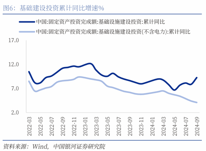 三是债务压力导致资金撬动作用降低,地方债券发行与实物工作量偏离。在财政收入降低和去年以来广义融资收紧的背景下,财政支出压力并未降低,必然导致地方政府存量债务的偿债和支出压力大幅提升。从今年专项债的发行和基建增速来看,部分新增专项债资金用于存量债务的偿付,资金撬动和投资拉动作用有所降低。根据10月8日发改委新闻发布会表述:今年3.9万亿专项债额度用于项目建设的规模为3.12万亿元,其余7800亿元中部分资金或用于存量债务置换,这与我们观察到地方专项债发行中没有公布“两书一案”的资金规模大致相当(截至10月8号为7176亿元)。从基建增速来看,8月份新增专项债发行规模7965亿元,较上月2815亿元显著提升,而基建投资(不含电力)累计增速进一步下行至4.4%,债券发行与实物工作量偏离。