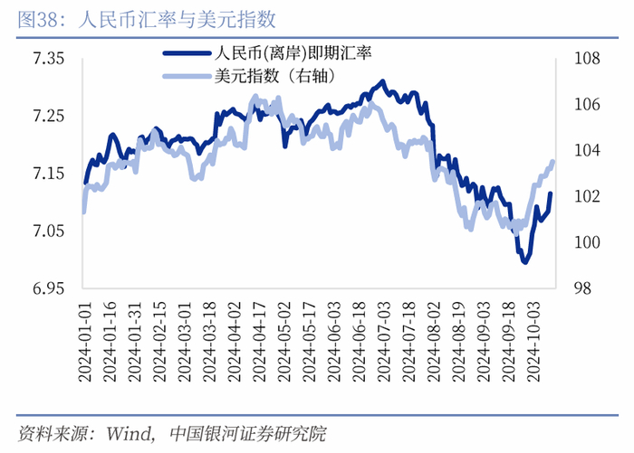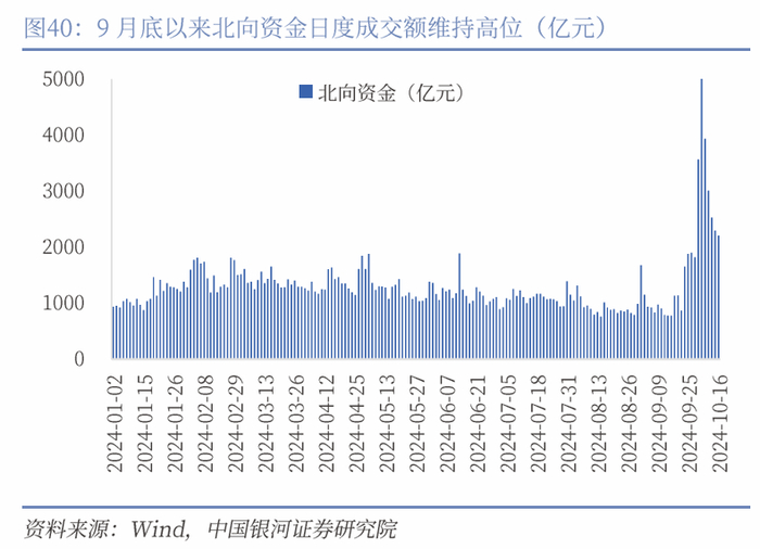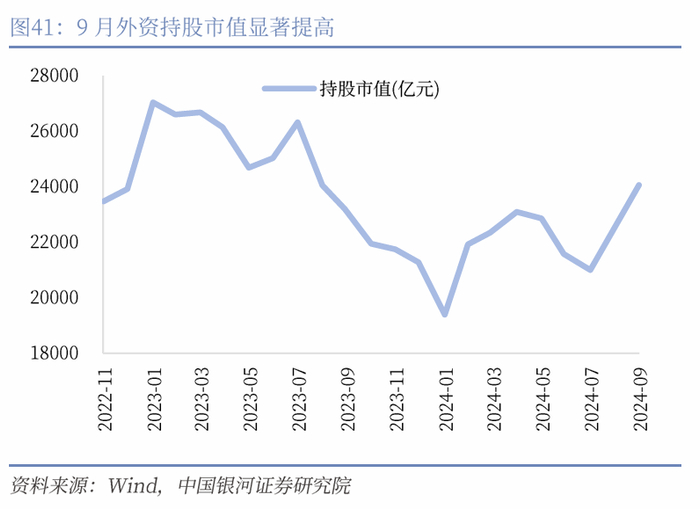 二是资金流向非美地区,人民币汇率压力缓解。一方面,中国资本流出压力减小,人民币汇率压力缓解。随着美联储宽松周期开启,带动美元资产收益率下降,促使资金更多流向非美地区,寻找新的避风港。同时,美联储9月进入降息周期,中美货币政策周期错位终止,资本流出压力减小,汇率压力阶段性解除。8月以来,人民币汇率整体进入升值通道,人民币汇率9月底最低触及7,近期有所贬值。另一方面,中国A股市场目前超低配,资本流入显著增多。政策转向后,境内外资本对中国权益市场的信心大幅度提升,各大投行迅速调整对于中国资产的看法,外资持有A股市值显著增长。目前,A股市盈率整体仍处于低位。北向资金日度成交额自9月24日开始增加,10月8日创出历史新高,近期虽有所下降,但仍在高位。数据显示,外资持有A股市值9月底达到2.41万亿,较7月底增加3063.6亿元,提升了14.6%。