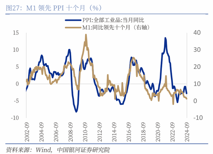 (1)M1领先PPI大概10个月。货币供给领先PPI的逻辑链条是货币供给→信贷→总需求变化→对工业产品的需求→工业企业端的物价变化。M1的增加意味着企业和居民的投资和消费潜力增强,总需求上升促使PPI回升。
