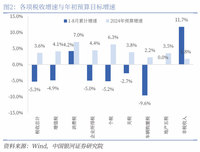 一是内需不足导致税收收入低于预期,狭义一般公共预算收支缺口走阔。根据今年财政预算草案目标,今年赤字率推算的平减指数为2.36%,全年税收收入的目标增速为3.6%(对应全年税收收入规模为18.8万亿元),其背后蕴含需求和物价企稳回升、企业盈利和税收收入逐步改善的预期。但今年前三季度运行情况来看,PPI已连续24个月停留在负增长区间,GDP平减指数也已经是连续6个季度为负。对应与名义经济增长密切相关的税收收入增速持续负增,1-8月份累计增速仅为-5.3%,大幅低于年初指定的3.6%增速目标,全年收入缺口预计在一万亿元以上。