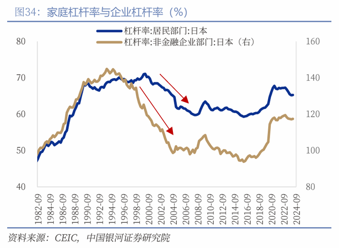 泡沫破灭后,企业和个人面临资产负债表的严重失衡。由于资产价格的迅速下跌,很多企业发现自己的资产价值不再足以覆盖原有的债务,企业和个人不得不优先偿还债务,而不是进行新的投资或消费,为了偿债,企业纷纷出售资产,进一步压低了资产价格,形成了所谓的“资产负债表衰退”,房地产和股市陷入长期低迷。随着资产价格下跌和企业削减开支,需求不足的问题逐渐显现,物价水平不断走低,形成了通缩压力。物价持续下跌进一步加剧了企业的偿债负担,因为实际债务负担在通缩环境中上升,企业和个人的支出进一步收缩,形成了恶性循环。从杠杆率来看,90年代中后期,居民和非金融企业部门的杠杆率上升速度明显放缓,也就是说居民和企业加杠杆的动力已经非常弱了,并且后续逐步进入去杠杆阶段,其中居民部门杠杆率从最高70%降至最低60%,企业部门杠杆率从最高140%降至最低100%。