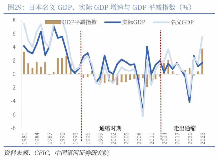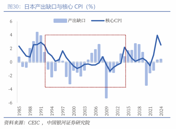 从日本经验来看,一旦实质性陷入通缩,经济将会陷入螺旋下行的恶性循环,货币政策失效的同时,财政政策的效果大大折扣。1989年末,日本经济泡沫达到顶峰,股票和房地产价格极度膨胀。为了遏制过热的经济和资产泡沫,日本央行开始收紧货币政策,大幅提高利率,导致股市和房地产市场的泡沫迅速破裂。泡沫破裂后,东京证券交易所的日经指数暴跌,房地产和土地价格也随之大幅下滑,资产价格在短短几年内几乎腰斩,企业和个人的资产负债表迅速恶化,日本经济陷入长期低迷,需求萎缩。面对经济泡沫破灭,日本当局对于经济复苏以及走出通缩过于乐观的错误估计,使其应对政策迟缓而犹豫。包括货币宽松、财政扩张以及银行的不良贷款处置都显得滞后而保守。这使得产出缺口逐步扩大,1993年-2013年的20年间,产出缺口除少数年份之外始终存在。这带来核心CPI低迷,多数年份处于负值。这期间,GDP平减指数负值运行,名义经济增速始终低于实际经济增速,日本“失去”名义增长将近20年。直到2013年之后安倍经济学登场,日本才逐步走出通缩。