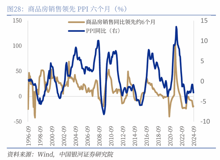 (2)商品房销售领先PPI约2个季度。商品房销售领先PPI约2个季度。商品房销售领先PPI的逻辑链条是商品房销售→总需求→对工业产品的需求→工业企业端的物价变化。在中国过去的经济增长模式中,房地产及其拉动的相关产业和工业企业生产关联性较强。