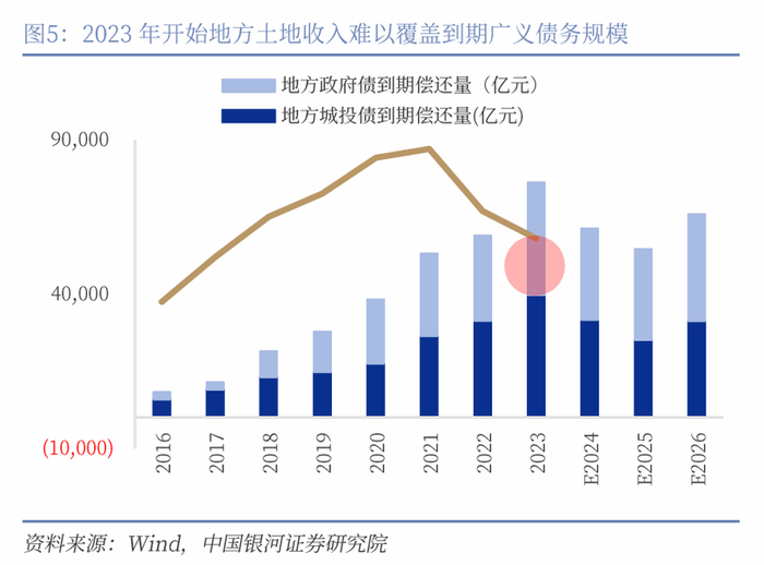 二是地产持续低迷下土地收入大幅降低,广义财政收支平衡突破临界点。自2021年房地产市场调整以来,地方土地出让收入持续大幅降低,至2023年底总收入规模已降至5.8万亿元,较2021年降低约33%。而过去长期发行,用于项目建设的专项债券和部分城投配套融资主要依靠土地收入偿还。自2023年开始全国土地收入规模已经低于地方专项债和狭义城投债务的到期偿还规模。广义财政的预算收支平衡打破,土地财政已经进入实质上的不可持续。