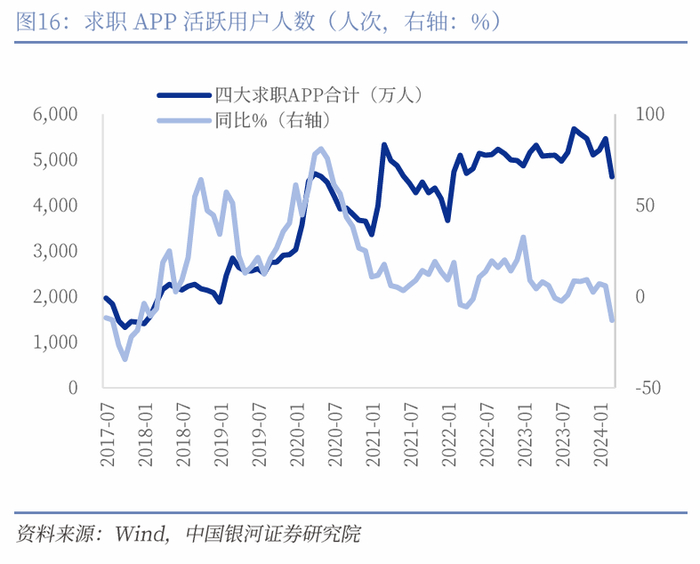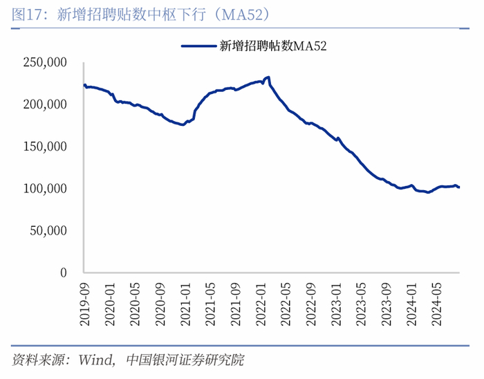 近几个月来,劳动力市场的压力持续增大,除了失业率中枢较去年有所提高之外,其他数据也能从侧面反应劳动力市场情况:(1)失业金保险支出显著增加,8月失业金保险支出录得172.7亿元,同比增长61.3%,这与本地户籍人口的城镇调查失业率更高相匹配。(2)央行储户问卷调查显示,当期就业感受指数和未来就业预期指数中枢从2023年Q1之后显著回落。(3)BCI企业招工前瞻指数和中小企业劳动力需求指数均保持低位,而民营企业和中小企业恰恰又是吸收就业的主要力量;(4)灵活就业人数持续增加,网约车驾驶员证数量在过去三年翻了一倍以上;(5)求职APP活跃用户数增长,显示劳动力供给大幅上行,而企业新增招聘贴数却在9月份进入负增长。