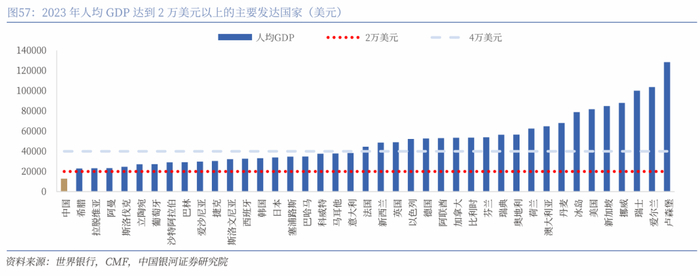 要实现两个一百年战略目标,全面建成社会主义现代化强国,仍面临较大经济发展任务和压力。根据中国宏观经济论坛(CMF)的研究,我国2035年要基本实现社会主义现代化,人均GDP要达到2.2-2.5万美元的中等发达国家水平,2050年要全面建成社会主义现代化强国,人均GDP要达到4-4.5万美元。数据显示,2023年我国人均GDP为1.26万美元,2035人均GDP要达到2.2-2.5万美元,则2024-2035年人均GDP增速分别要达到4.74%、5.87%。同时,2050年人均GDP要达到4.2万美元、4.5万美元,假设2035年人均GDP为2.2万美元,则2035-2050年中国人均GDP增速分别要达到4.41%、4.89%。2024年第三季度我国经济增速仅为4.6%,相较于长期目标增速偏低。根据两步走战略目标,2023年我国人均GDP为1.26万美元,只有加大逆周期调节力度,尽可能保持较长时间中高速增长,努力实现2035年人均GDP达到2.5万美元的目标,才能大大减轻2035-2050年的经济发展水平要求和压力,助力两个一百年目标顺利实现。