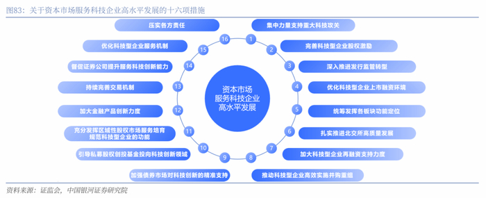 资本市场赋能新质生产力的政策不断加码,推动多层次资本市场制度体系不断完善。2016年,国务院在《“十三五”国家科技创新规划》中强调,通过大力发展多层次资本市场实现完善科技与金融结合机制。2024年4月,《关于资本市场服务科技企业高水平发展的十六项措施》(以下简称“资本市场服务科技企业十六条”)提出包括发挥各板块功能定位、推动科技型企业高效并购重组、加强债券市场支持等在内的16条措施要求,以期推动资本市场在加快推进高水平科技自立自强、提升服务新质生产力发展质效方面发挥更大更有效的作用。整体来看,既有政策一方面通过引导资本市场优化股权投融资通道提升资源配置效率,另一方面,通过创新债务融资工具等方式保障科技企业再融资,“双管齐下”促进资金流向科技企业。