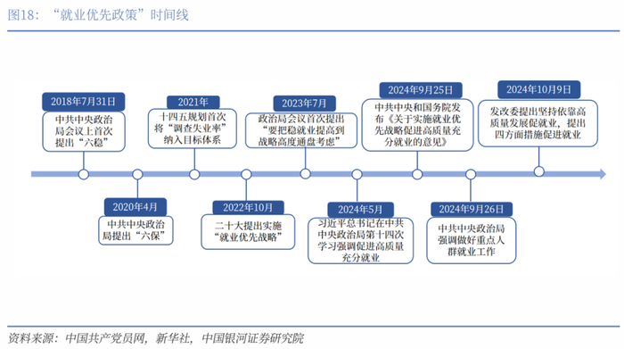 在上述背景下,习近平总书记在今年中共中央政治局第十四次学习时强调,促进高质量充分就业,是新时代新征程就业工作的新定位、新使命,不断增强广大劳动者的获得感幸福感安全。2024年9月25日,中共中央和国务院发布《关于实施就业优先战略促进高质量充分就业的意见》,这是中央层面首次出台的促就业指导性文件,部署了拓展高校毕业生等青年就业成才渠道、保障平等就业权利等二十四条举措。9月26日,中共中央政治局召开会议,分析研究当前经济形势和经济工作,强调要守住兜牢民生底线,重点做好应届高校毕业生、农民工、脱贫人口、零就业家庭等重点人群就业工作。10月9日,在发改委发布会上,国家发展改革委副主任李春临表示,将大力实施就业优先战略,坚持依靠发展促就业,并指出“扩大就业关键还是要发展,尤其是高质量发展。”总共说明了四方面措施共同促进就业:一是扩大有效需求,通过中央预算内投资的引领作用和激发民间投资活力,对能够吸纳较多就业的项目给予更大的支持。二是增强新兴产业就业创造效应,以创造更多的知识技能型岗位;三是拓宽生活服务性行业就业空间,创新服务消费模式,发展银发经济,释放养老、家政、托育、物流等领域的就业潜力。四是发挥职业教育和技能培训的作用。表明政策对于就业市场的重视,以及通过提升就业质量来促进经济高质量发展的策略。