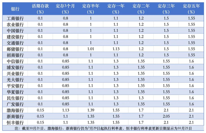 10月18日以来,多数股份行已经跟进国有大行,对不同品种的存款利率进行了新一轮调整,其中,招商银行在18日与大行同步调整,平安银行则在19日更新了利率表,21日又有中信银行、浦发银行、兴业银行、光大银行、华夏银行、民生银行、广发银行更新了利率表,其他,恒丰银行、浙商银行、渤海银行尚未跟进更新。